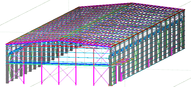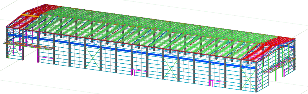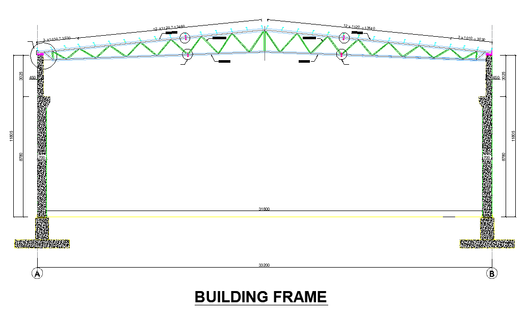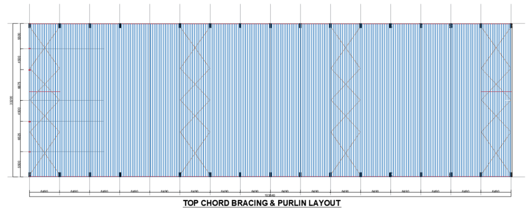 該項目為桁架式輕鋼屋面廠房結(jié)構(gòu),總長104米,寬33.2米,檐口高度12米,主體采用平面矩形管桁架結(jié)構(gòu),并在桁架上下弦設(shè)置屋面支撐。項目涵蓋鋼屋架、檁條、抗風(fēng)柱、吊車梁及雨棚等部分的設(shè)計與加工制作,總用鋼量約170噸。項目設(shè)計充分考慮當(dāng)?shù)厥褂眯枨?,縱向布置兩臺10噸吊車,西側(cè)山墻面另設(shè)5噸吊車,結(jié)構(gòu)整體坐落于已完工的混凝土柱上,兼顧實用性與安全性。